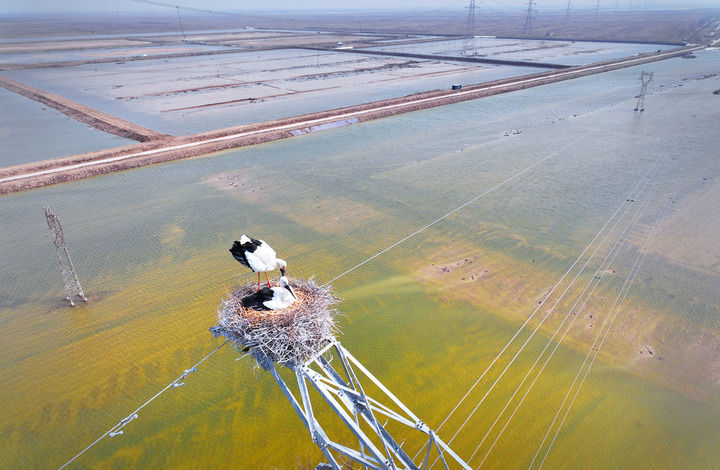科技的力量,不仅体现在全方位的监测守护,更融入鸟类栖息的每一处细节。穿行在湿地间,只见一座座输电铁塔上,国家一级保护动物东方白鹳的巢穴错落分布。在铁塔的绝缘子串上,一排排红色的“小红伞”——复合绝缘防鸟罩格外醒目,它们既为电网安全筑起屏障,也为鸟类栖息留出空间。